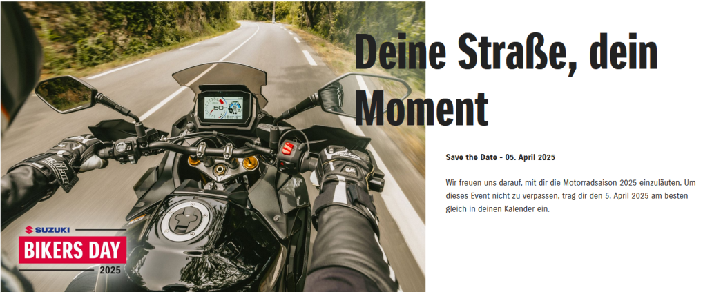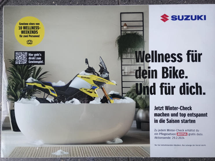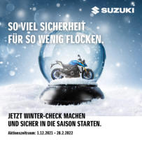 Du hast mit deinem Bike viel erlebt in diesem Jahr? Dann gönn ihm jetzt eine Auszeit in den besten Händen. Mit professioneller Pflege und allem Zubehör. Es ist wie Weihnachten für deine Maschine und das perfekte Fitness-Programm für die neue Saison. Wie das geht? Ganz einfach – mit der Suzuki Winterservice-Aktion*. Dein Suzuki Partner kümmert sich nicht nur um die anfallenden Wartungsarbeiten. Er macht auch einen kompletten Check-up. Kleinere oder größere Reparaturen sind ruckzuck erledigt. Und wenn du noch innerhalb der Garantiezeit bist – umso besser. Dann bist du ohnehin genau richtig. Du musst dich um nichts kümmern. In den meisten Fällen brauchst du noch nicht einmal deine Maschine zum Händler zu bringen. Viele unserer Suzuki Partner holen sie einfach ab. Und bringen sie dir nach getaner Arbeit wieder oder - je nach Verfügbarkeit - lagern das Bike sogar über den Winter für dich ein. Dann hast du zu Hause mehr Platz und deine Suzuki ist garantiert startklar, wenn die ersten Sonnenstrahlen zur Frühlingstour einladen. Als Erster frühlingsfit - als Erster wieder auf der Straße. * Aktionszeitraum: 1. November 2024 bis 28. Februar 2025. Nur bei teilnehmenden Suzuki Motorrad Partnern.